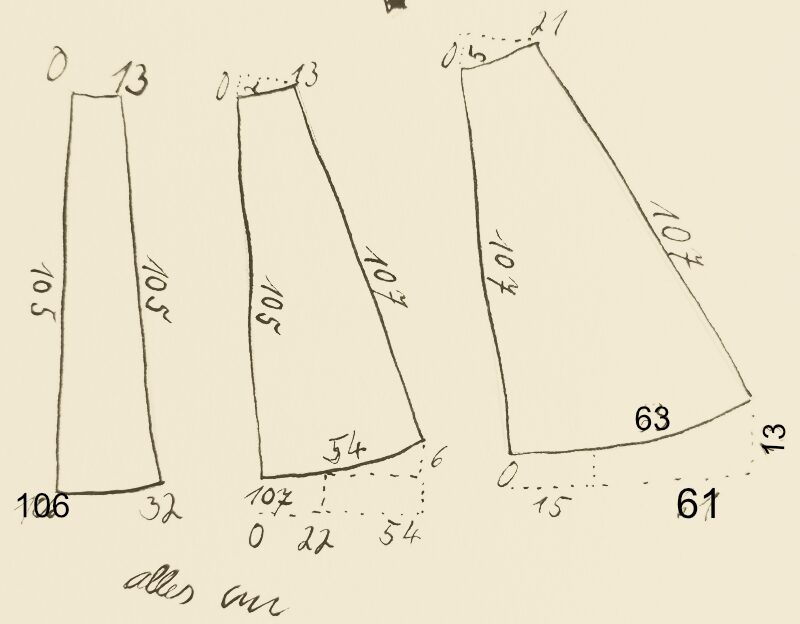 Das Schnittmuster in dem Buch sah so aus. Die erste Bahn ist die vordere Rockbahn. Sie ist 105 cm lang. Die Länge muss man ja eh anpassen. Oben ist die Bahn 13 cm breit und unten 32. Meine ist 14 cm breit.