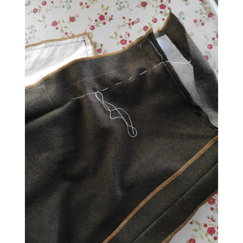 Ich hab den Rockbund oben noch abgesteppt für eine bessere Stabilität. Hat man dicken Stoff und kippt der Nähfuß hinten runter, macht es sich gut, wenn man ein Stück Stoff drunter legt. So ist der Nähfuß vorn und hinten auf gleicher Höhe und bleibt nicht stecken.
