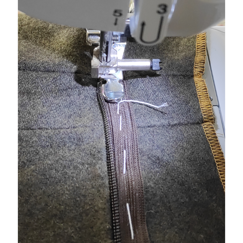 Am besten lässt sich der Reißverschluss mit so einem schmalen Reißverschlussfuß annähen (siehe letztes Bild). Denn man muss die Zähnchen vom Reißverschluss soweit auseinander biegen, wie es geht, um daneben nähen zu können.