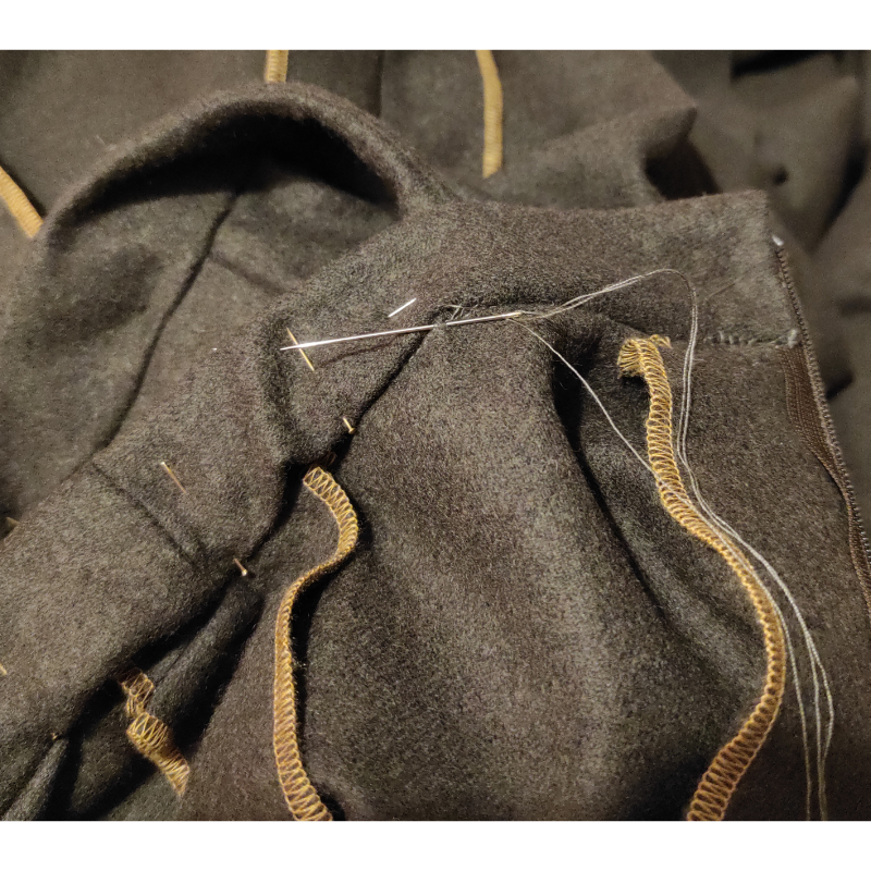 Aber vorher nicht vergessen den Faden durch Bienenwachs zu ziehen. Das sorgt für eine bessere Haltbarkeit und weniger Verwurstelungen oder gar Knoten. Ein Graus eines jeden Schneiders: verhedderter Faden.