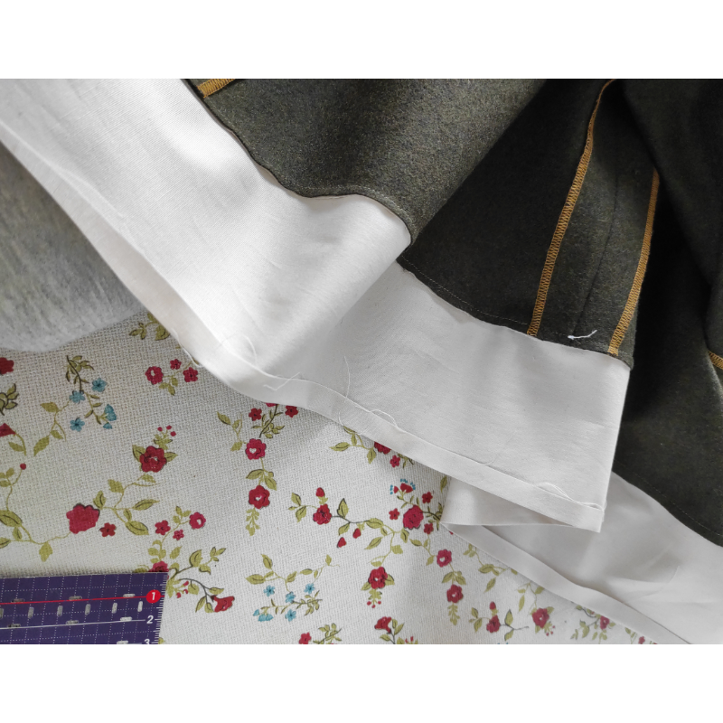 Ich hab für den Rocksaum einfach einen Stoffstreifen rechts auf rechts ans Rockende genäht, was ca. 5 cm breit ist. Danach hab ich ihn nach innen umgeklappt und angenäht.