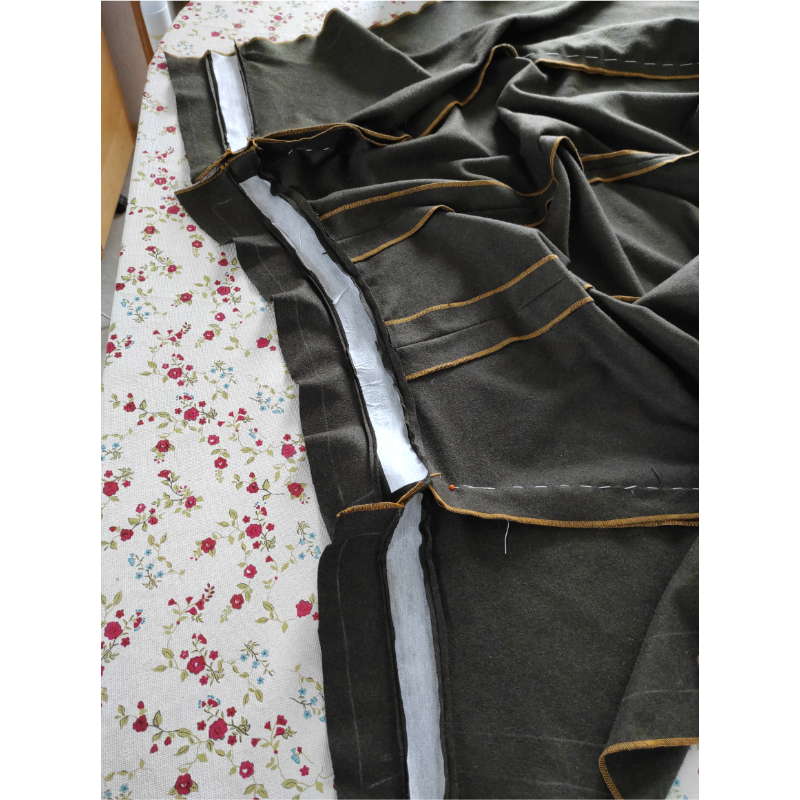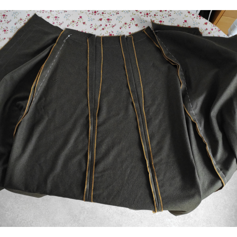 Anschließend werden die zwei seitlichen Stoffbahnen mit der vorderen zusammen genäht. Die zwei hinteren Rockbahnen hab ich erst einmal nur mit den seitlichen zusammen gesteckt, aber noch nicht genäht.