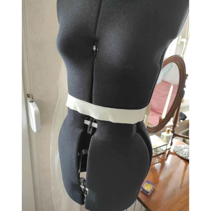 Um auf Nummer sicher zu gehen, hab ich den Rockbund aus alten Stoffresten ausgeschnitten und der Schneiderpüppi angezogen. So sieht man, ob er passt. Man kann ihn auch an sich selbst anhalten.
