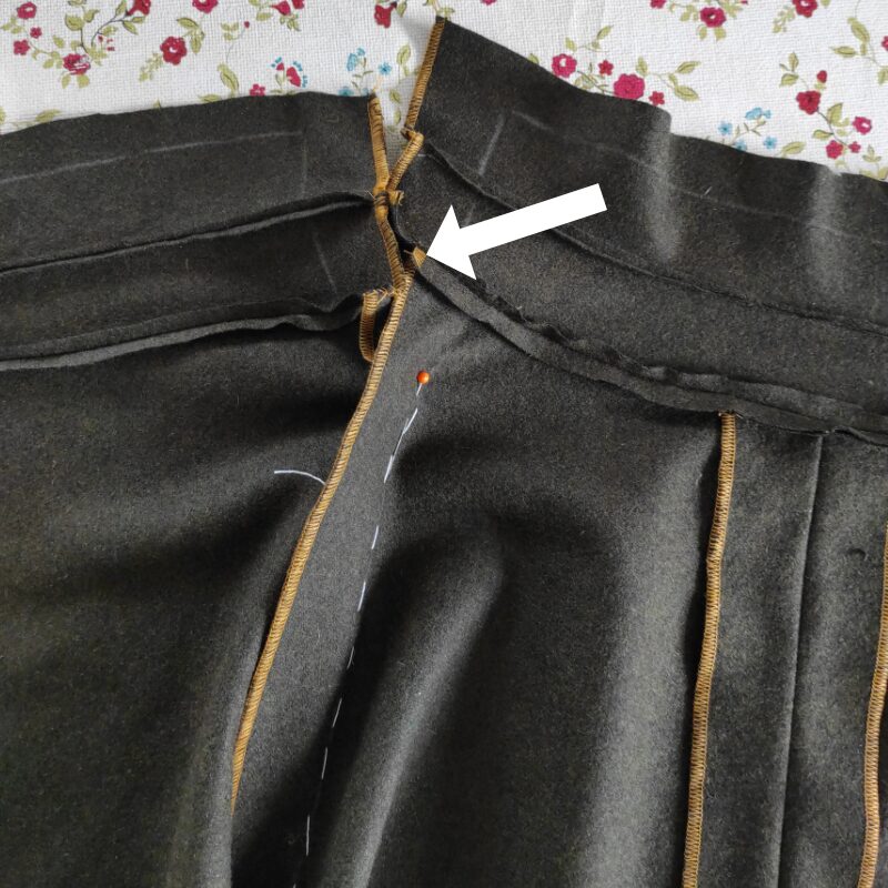 Anschließend werden die zwei hinteren Bahnen mit den seitlichen Bahnen zusammen genäht. Dabei muss man aufpassen, dass die Nähte vom Rockbund exakt zusammentreffen (siehe Bild 3), was ein bisschen knifflig ist.