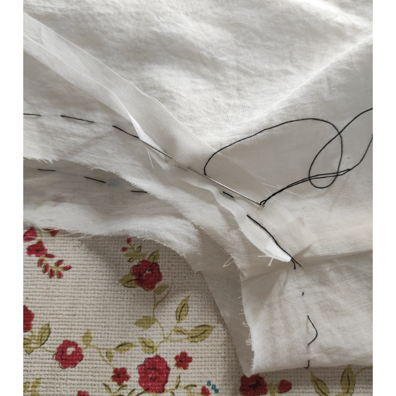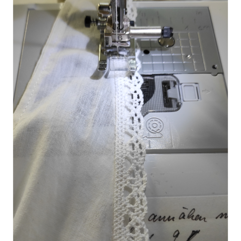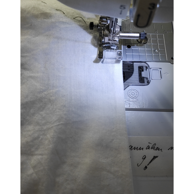 Ich nähe die Hilfsnaht ca. mit 1 cm Abstand von der Außenkante, aber es würde auch 0,5 cm reichen.