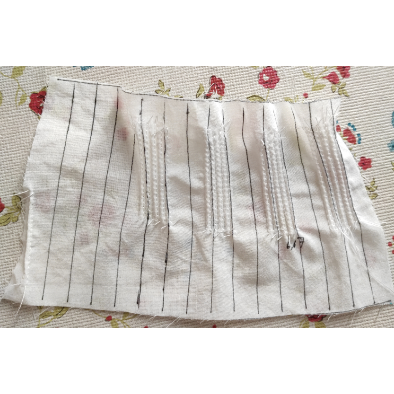 Vorher hab ich mir immer nach 1 cm Markierungen mit einem Stift gemacht. Somit wusste ich die Breite des Stoffs bevor die Biesen genäht wurden und konnte sie am Ende nachmessen, um wieviel sie geschrumpft ist.