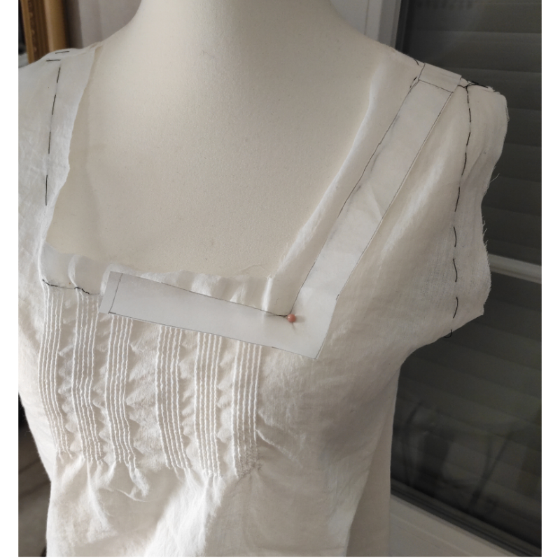 Dann kann man Schnittmusterpapier darüber legen und den Ausschnitt nachzeichnen. 1,5 -2 cm Breite reicht vollkommen zu.