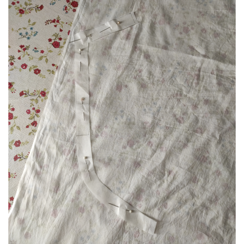 Im nächsten Schritt wird er dann mit Hilfe von Stecknadeln auf den Stoff geheftet, ausgeschnitten und rechts auf rechts von außen ringsherum an den Ausschnitt genäht. Vorher hab ich den Beleg vorn und hinten noch zusammen genäht.